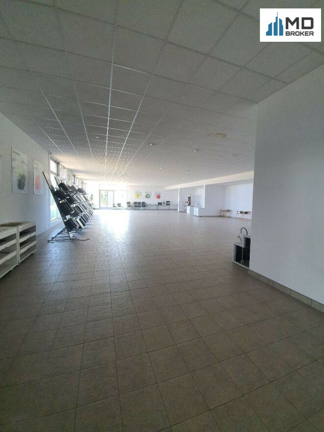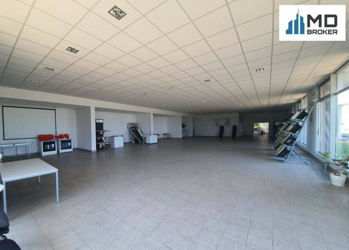 The office and social section is constructed with reinforced concrete, except for the exhibition hall, which is built with a steel structure. On the ground floor of the office building, there is a reception area, an exhibition hall (285.3 m²) with a set of toilets (including one for disabled persons), a meeting room, sales department offices, and a kitchenette. The upper floor contains office rooms, a kitchenette, and a set of toilets. From the hallway on the upper floor, there is access to a terrace located on the roof above the social area. Vertical communication is provided by a staircase.